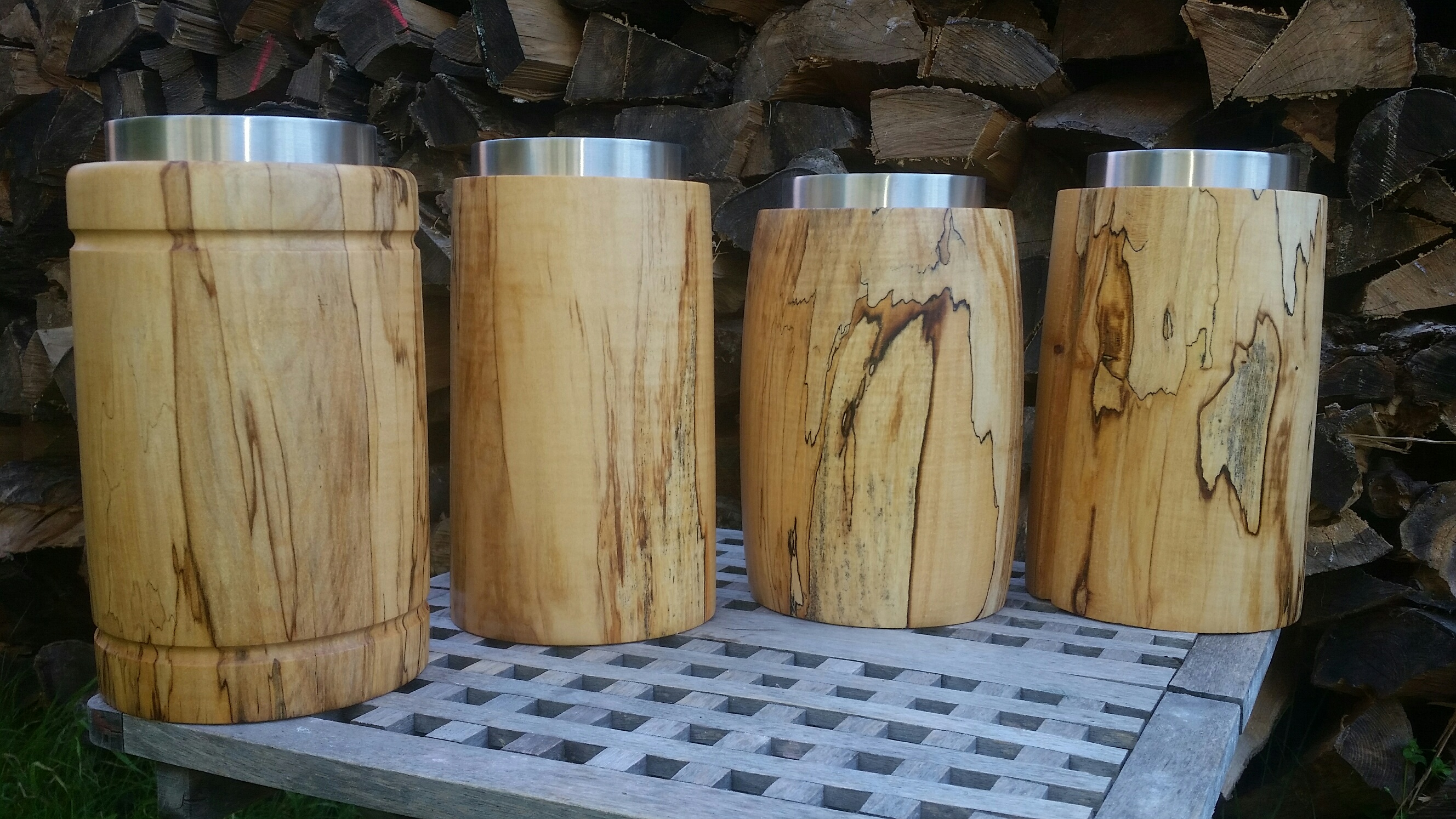 Die Weinkühler gibt es in den Unterschiedlichsten Hölzern. Eiche, Kirsch, Nuss, Esche, Ahorn. Sie sind auch von der Form immer Unterschiedlich und sehr Individuell. die Oberfläche ist glatt geschliffen und innen und außen geölt. Das doppelwandige Niro-Inlay ist immer dabei.