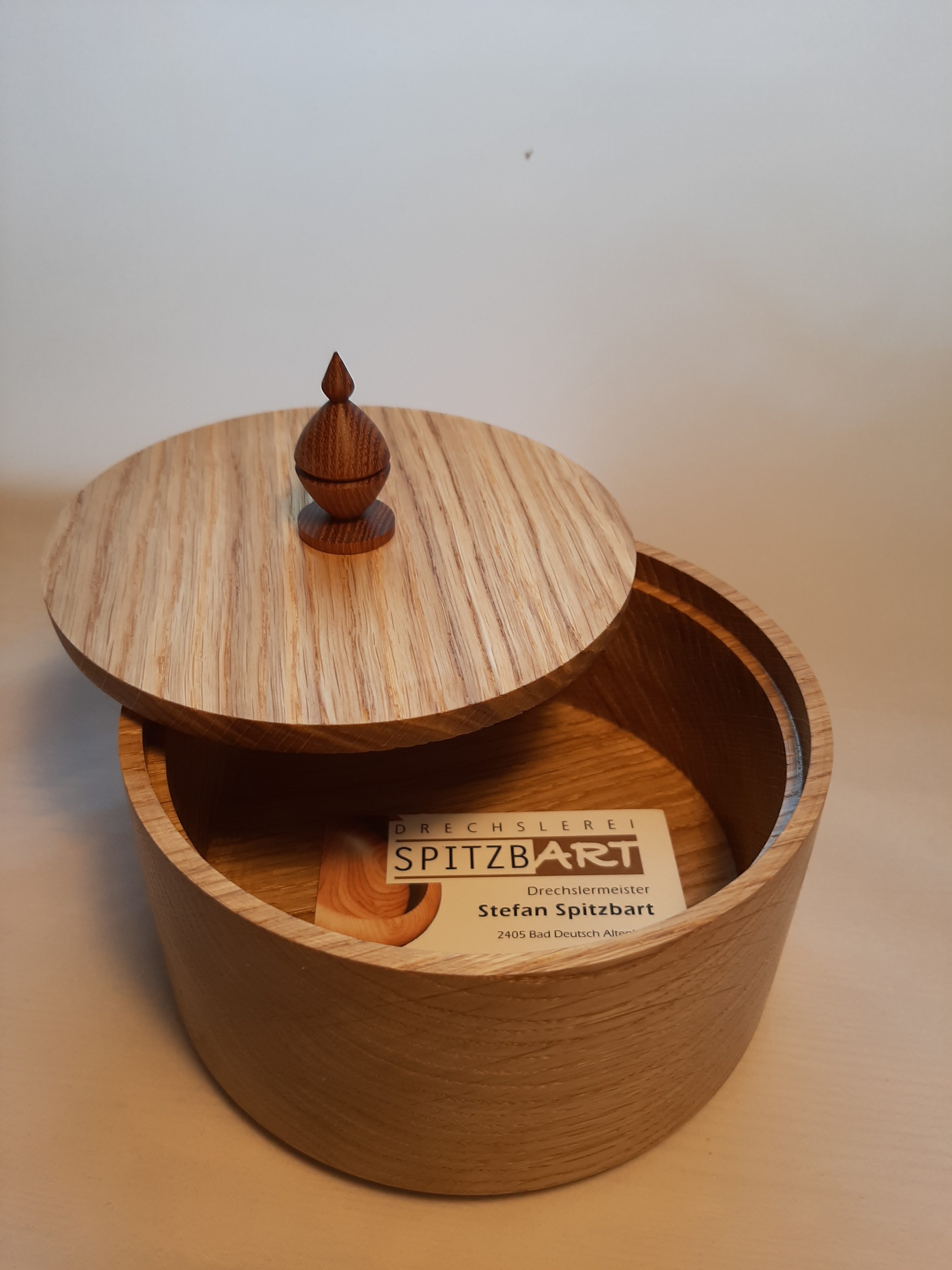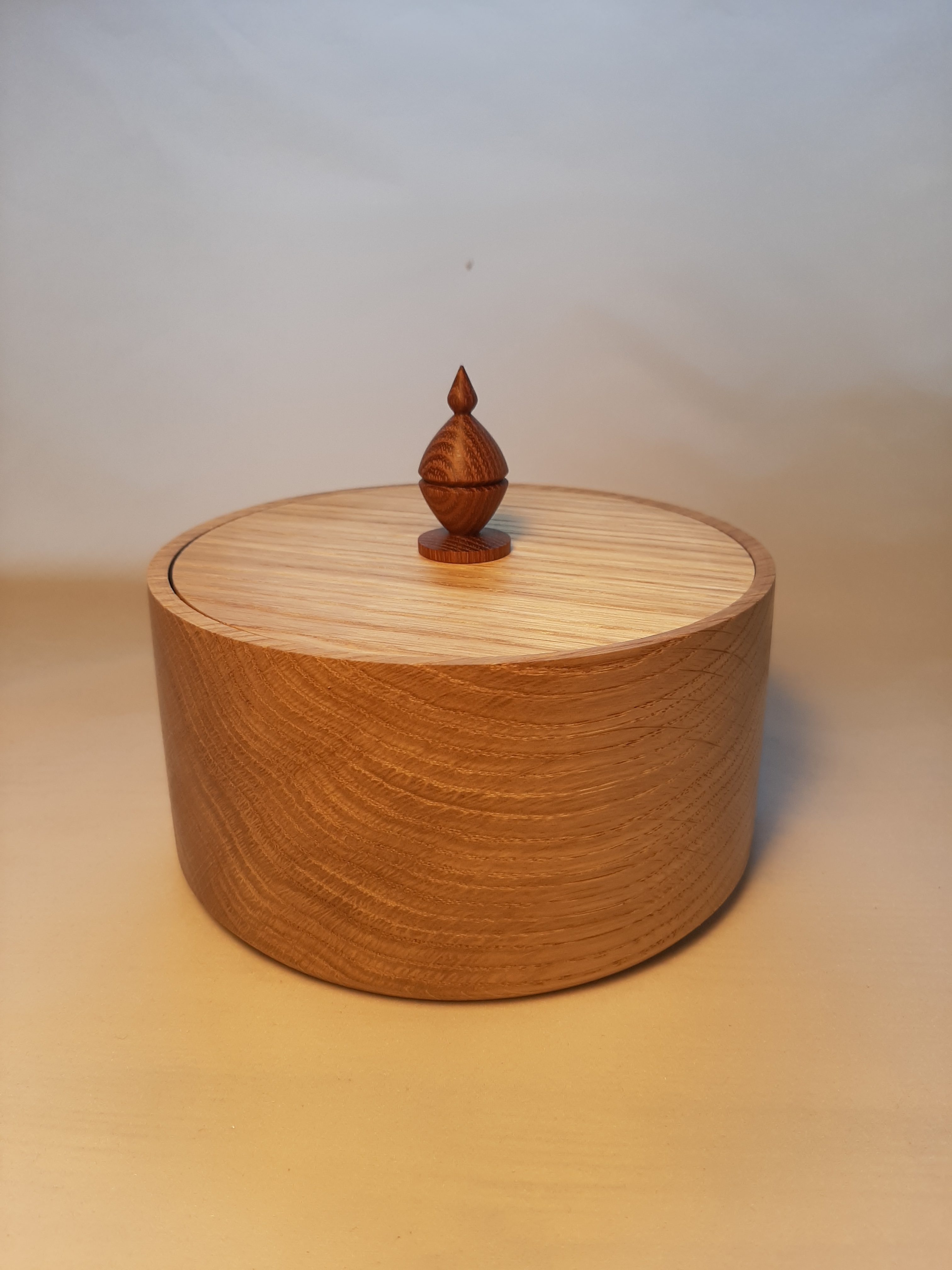 Die Schmuckdosen sind aus Eiche gedrechselt fein geschliffen und geölt. Die Griffe sind aus Nuss oder gedämpfter Akazie. Die Dosen gibt es in 2 Größen, die Griffe sind Individuell und es gibt keine 2 gleichen.