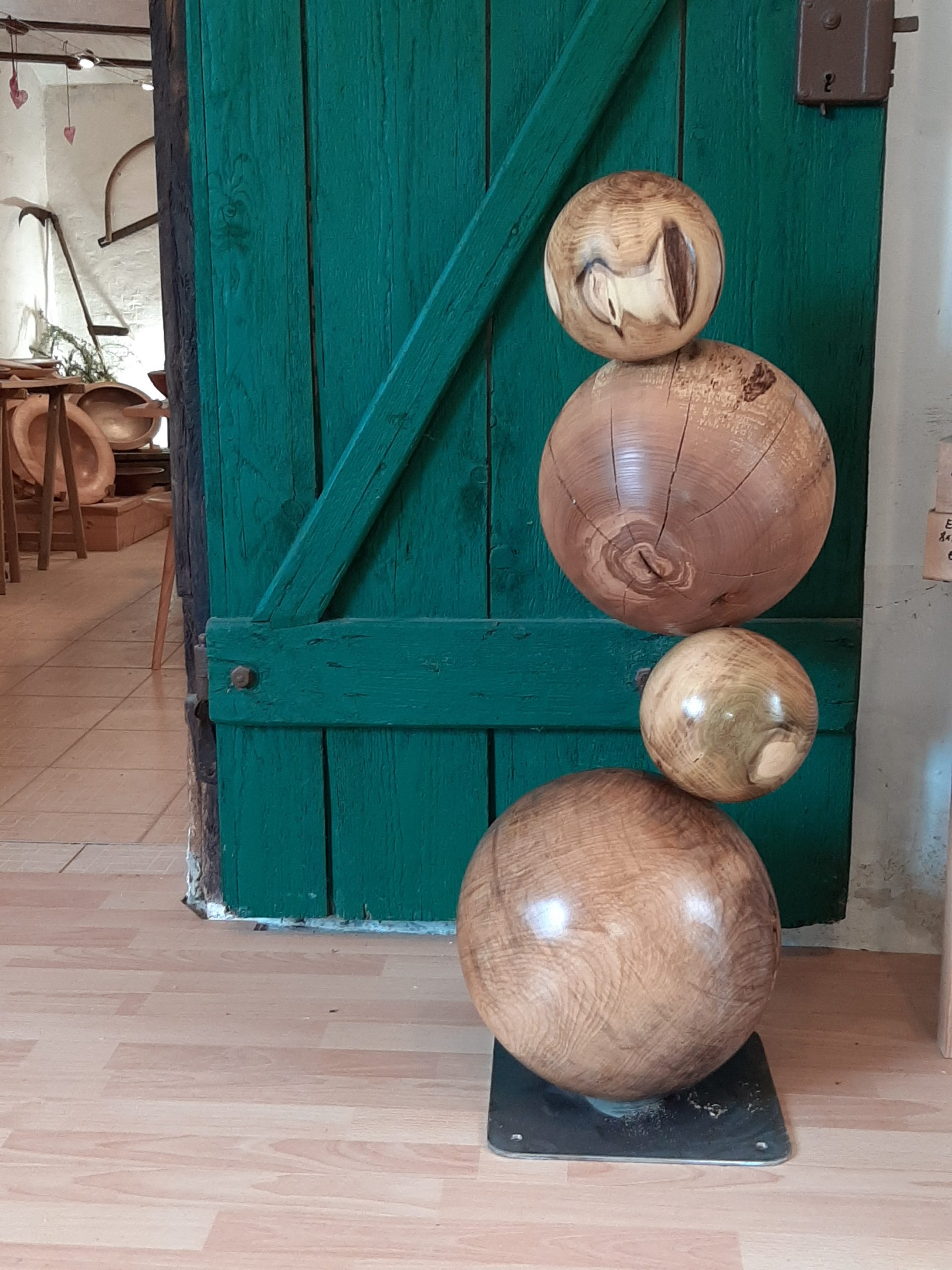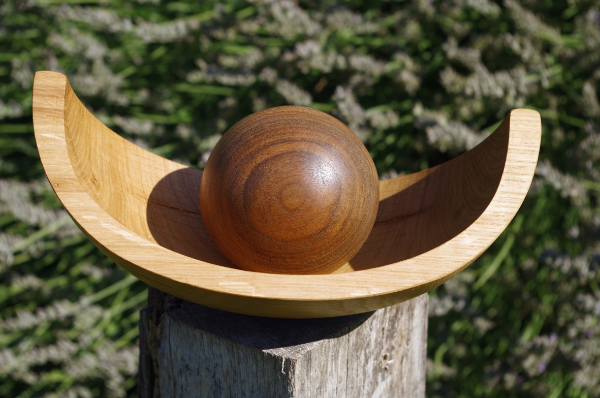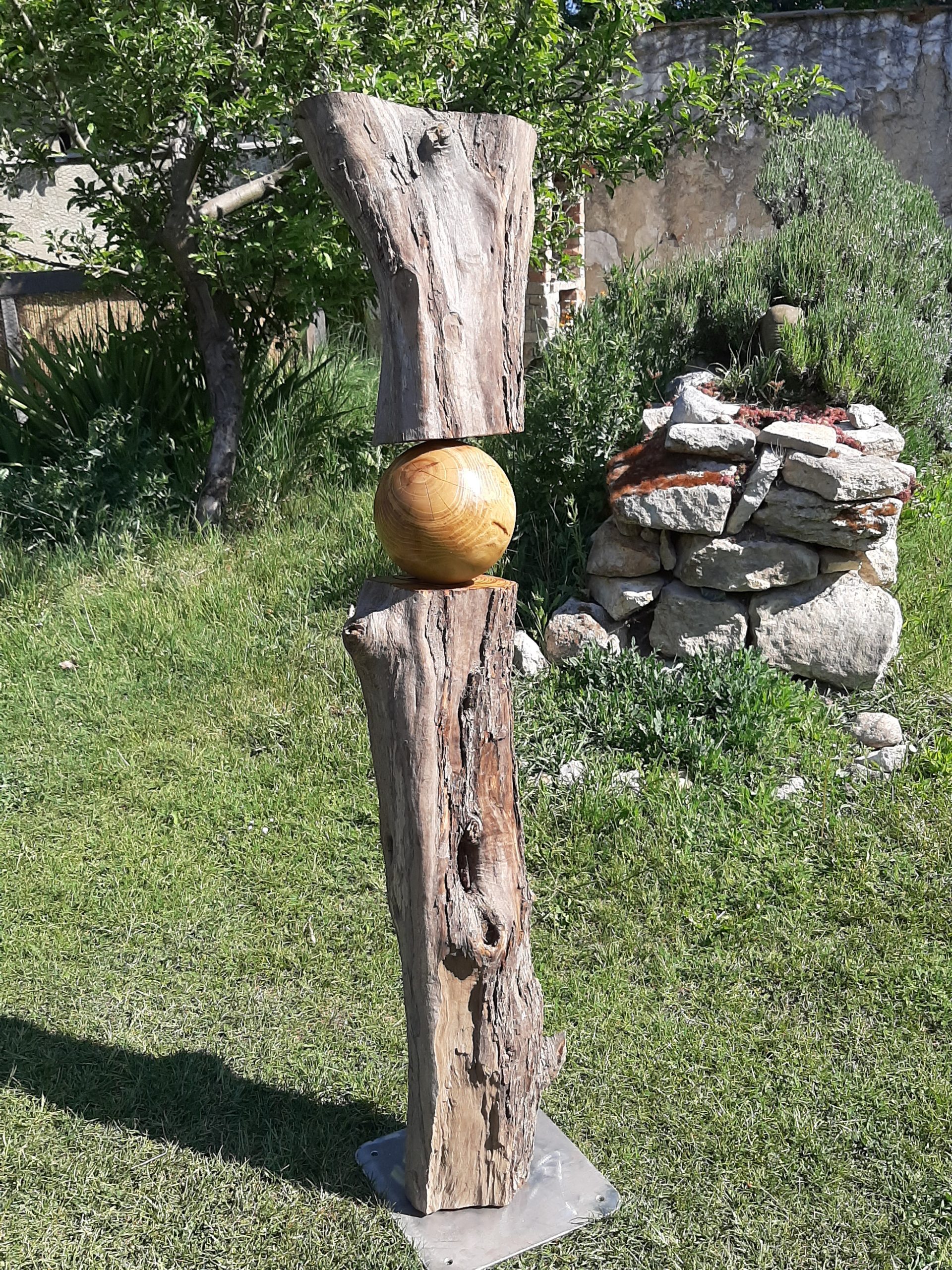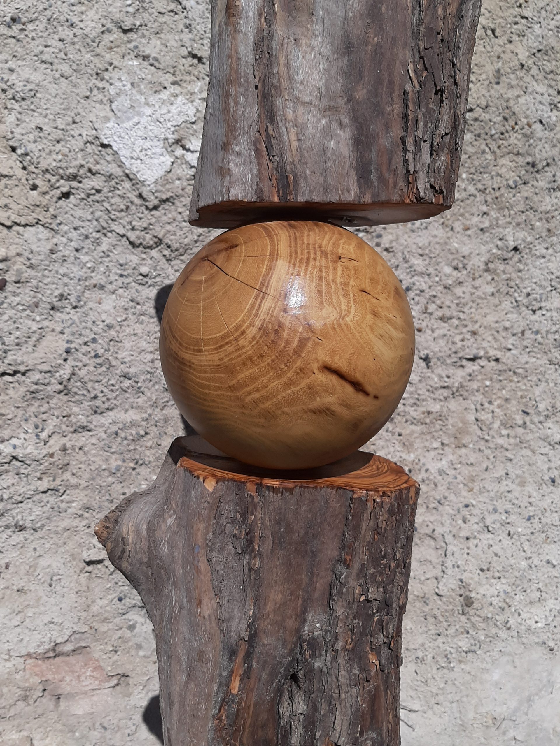 Ein schlankes und sehr präsentes Objekt. Es stellt das Gleichgewicht unter und oberhalb der Kugel dar. Der Olivenholz Stamm wird hierbei von einer Kugel aus Akazie getrennt. (Preis auf anfrage).