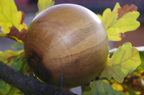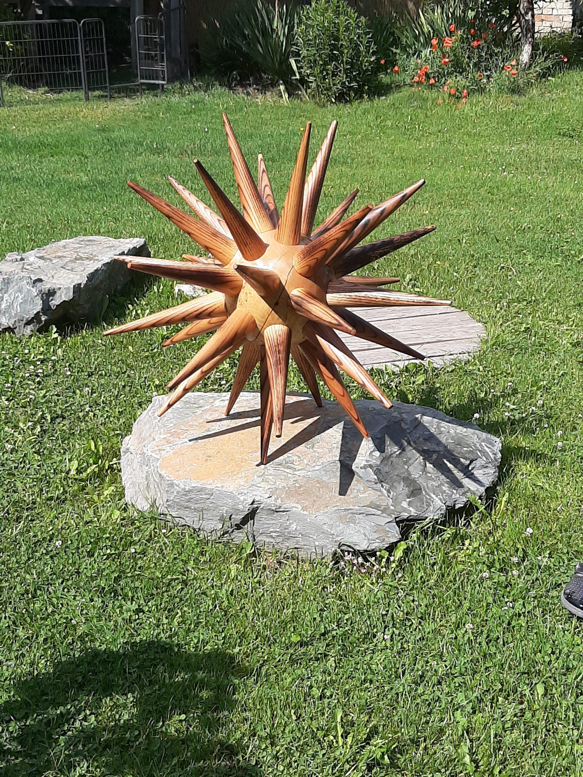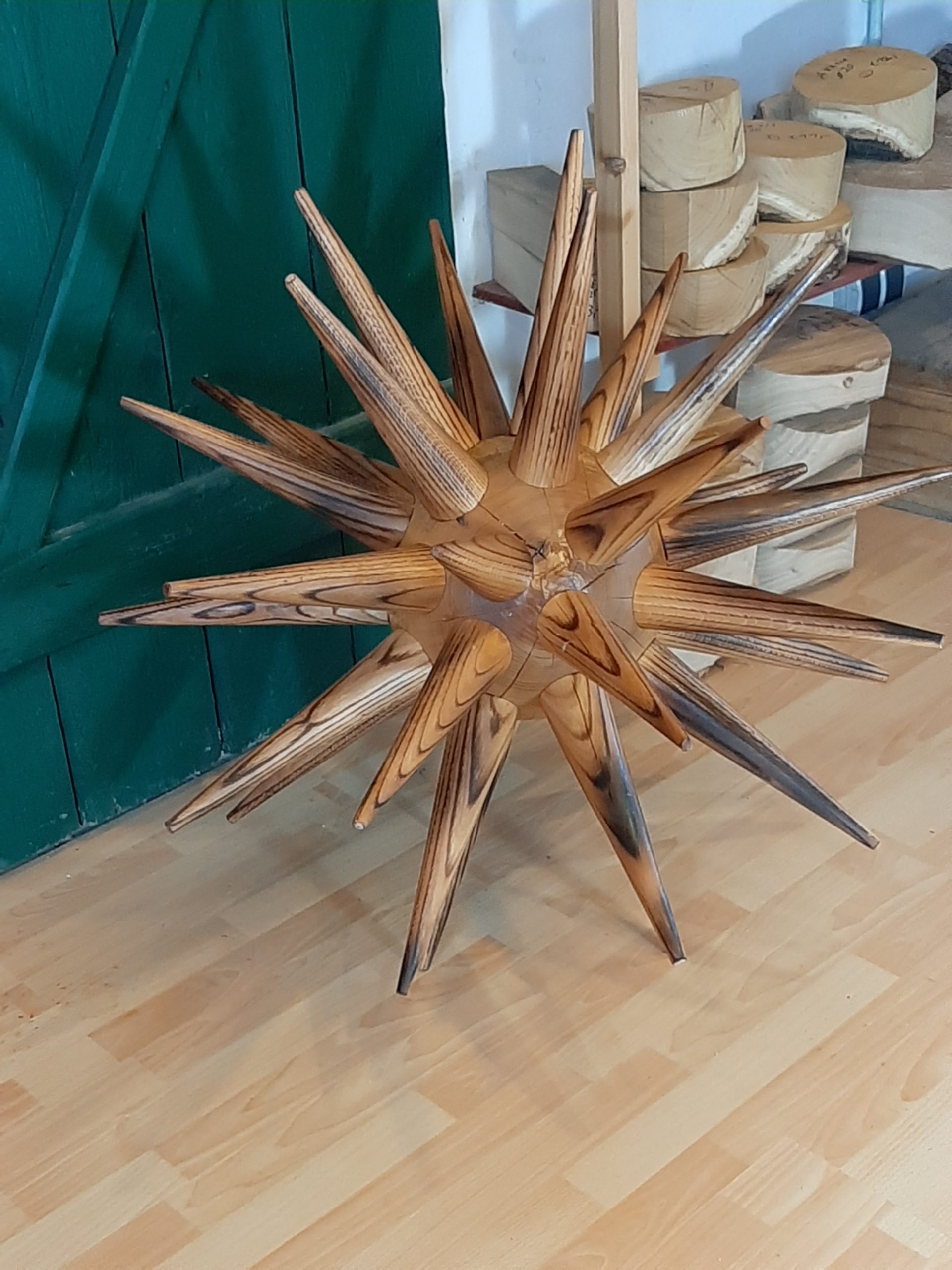 Der Seeigel war schon lange ein Wunschprojekt von mir und das habe ich mir erfüllt. Manchmal muss es einfach groß sein. Er besteht aus 32 Spitzen aus Roteiche, die auf einer Kugel aus Esche mit 30 cm Durchmesser montiert sind. Die Spitzen wurden vor dem Ölen geflämmt, um die Maserung noch deutlicher zu zeigen. (Preis auf Anfrage)