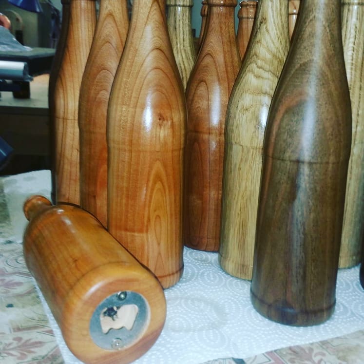 Die aus Esche gefertigten Bierflaschen, sind auf jeder Party der Hit. Auf der Unterseite ist der Kapselheber versteckt. Die Oberfläche ist Geflämmt um die Maserung besser hervorzuheben. Die Öffner bekommst du bei mir im Shop und auf jeden Markt.